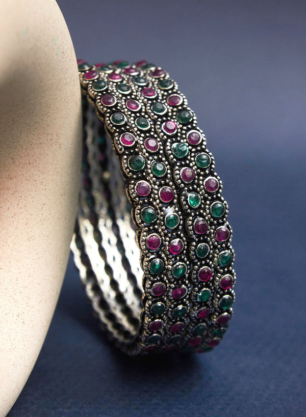 Wear these silver stone bangle with black straight cape and denims for a simple and easy look this rakhi.