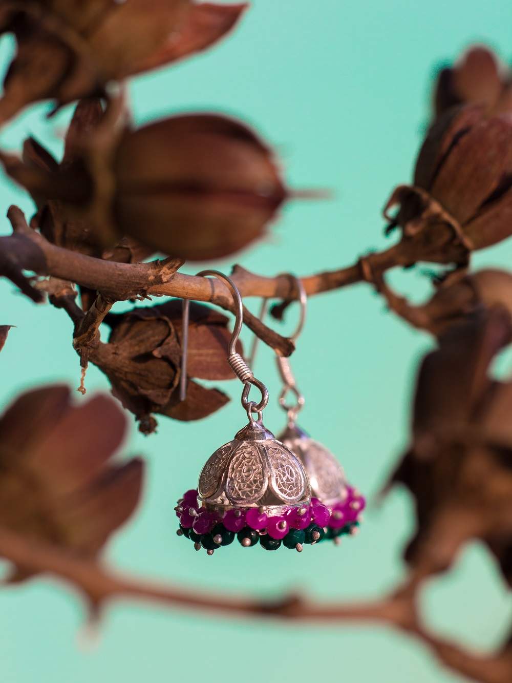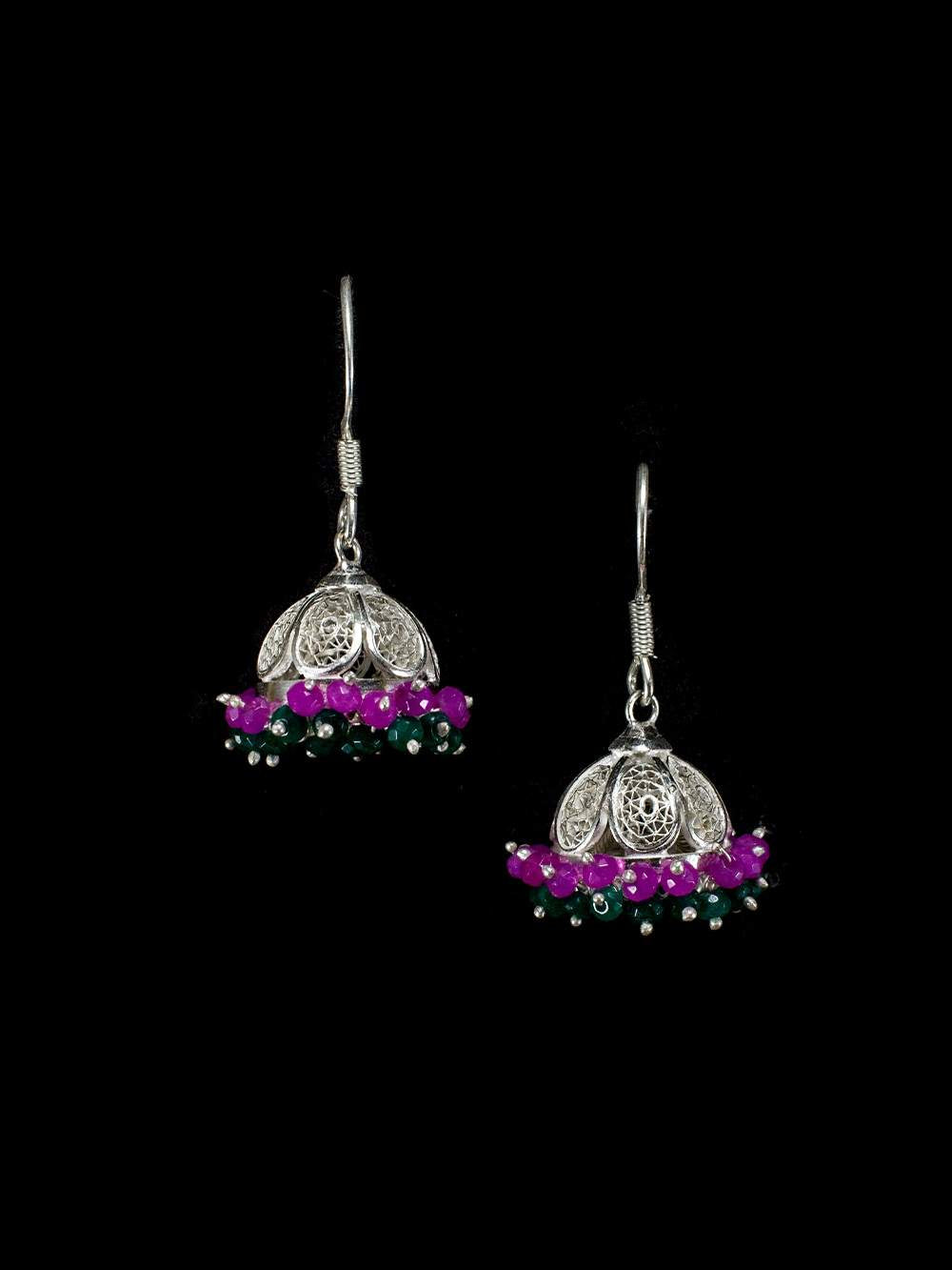 These jhumkas are a tiny marvel and are a delightful addition to your jewelry collection. The jhumkas are handcrafted in the fine art of Silver Filigree. The jhumkas have pink and green beads at the bottom.