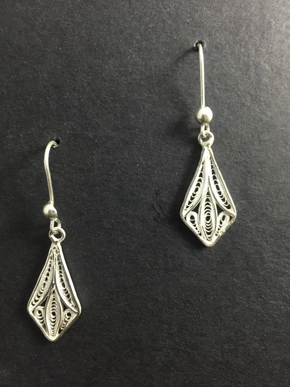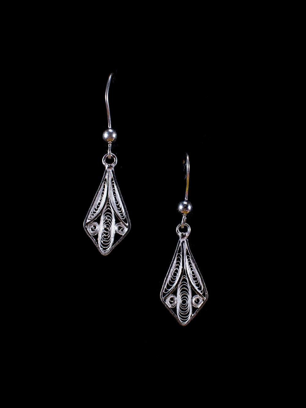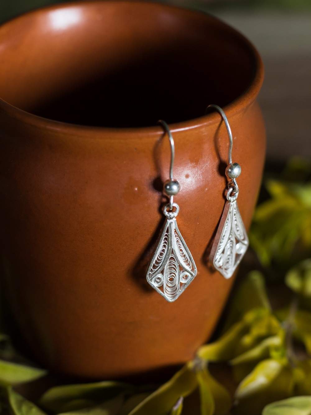 These Tarakasi earrings showcase the artisan’s meticulous attention to detail. Delicate silver forms into captivating diamond shapes, a testament to the timeless beauty of Odisha’s filigree work.