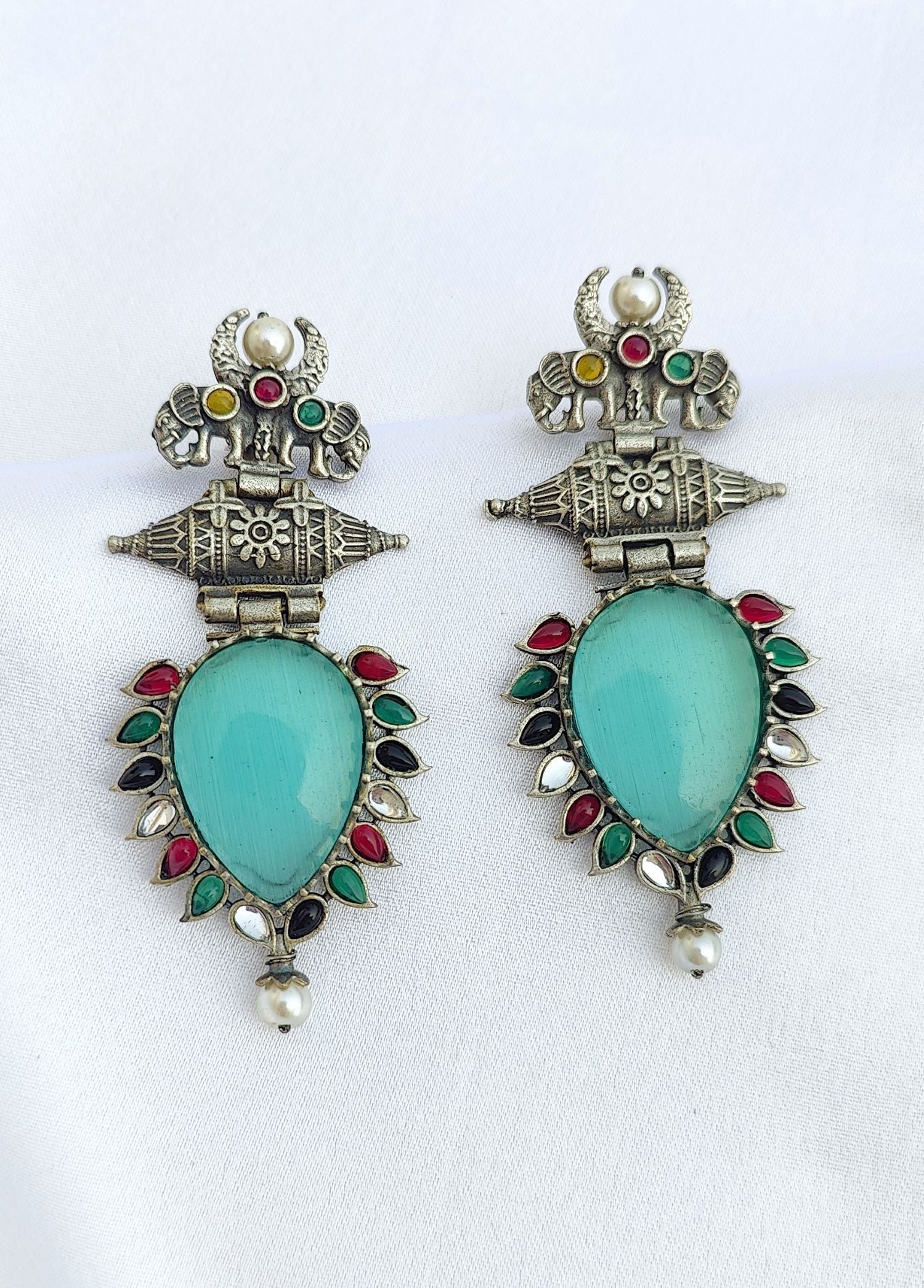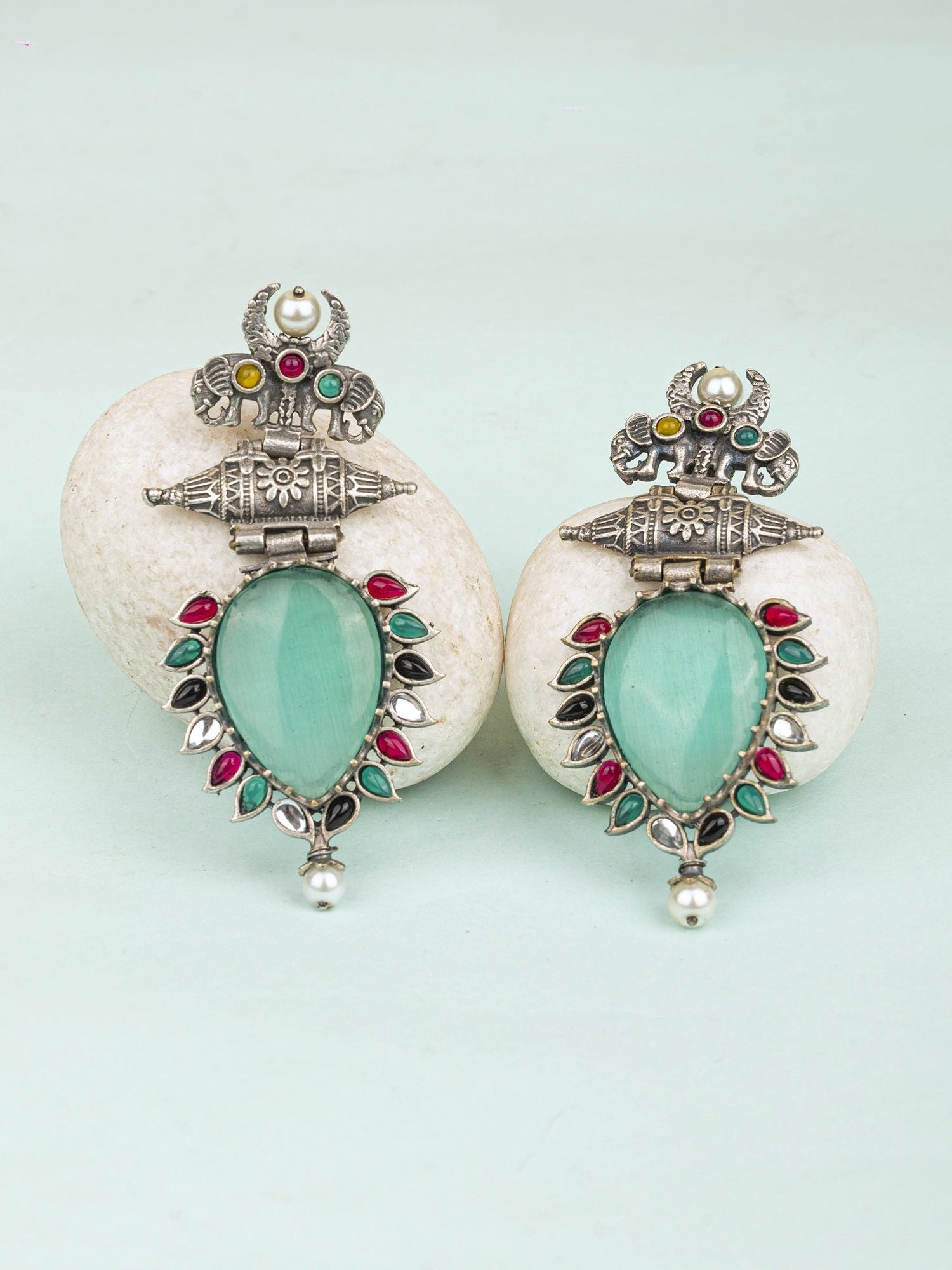Make a powerful fashion statement with these exquisite oxidized silver earrings with green elephant motifs earrings! These earrings have been designed for festive occasions to make you look as beautiful and unique as ever. Whether you want to wear it to a wedding, festival, party, or any other religious occasion, these stunning earrings will make you the showstopper. Crafted from premium quality oxidized silver and plated with green accents, these earrings offer a brilliant look alike of silver jewellery yet are more affordable than commonplace pieces. They are designed for young girls and women to make them look beautiful and more stylish. Not only that, they also make for a great gift for loved ones on special occasions! Get a sizzling look with these oxidized silver earrings with motifs.