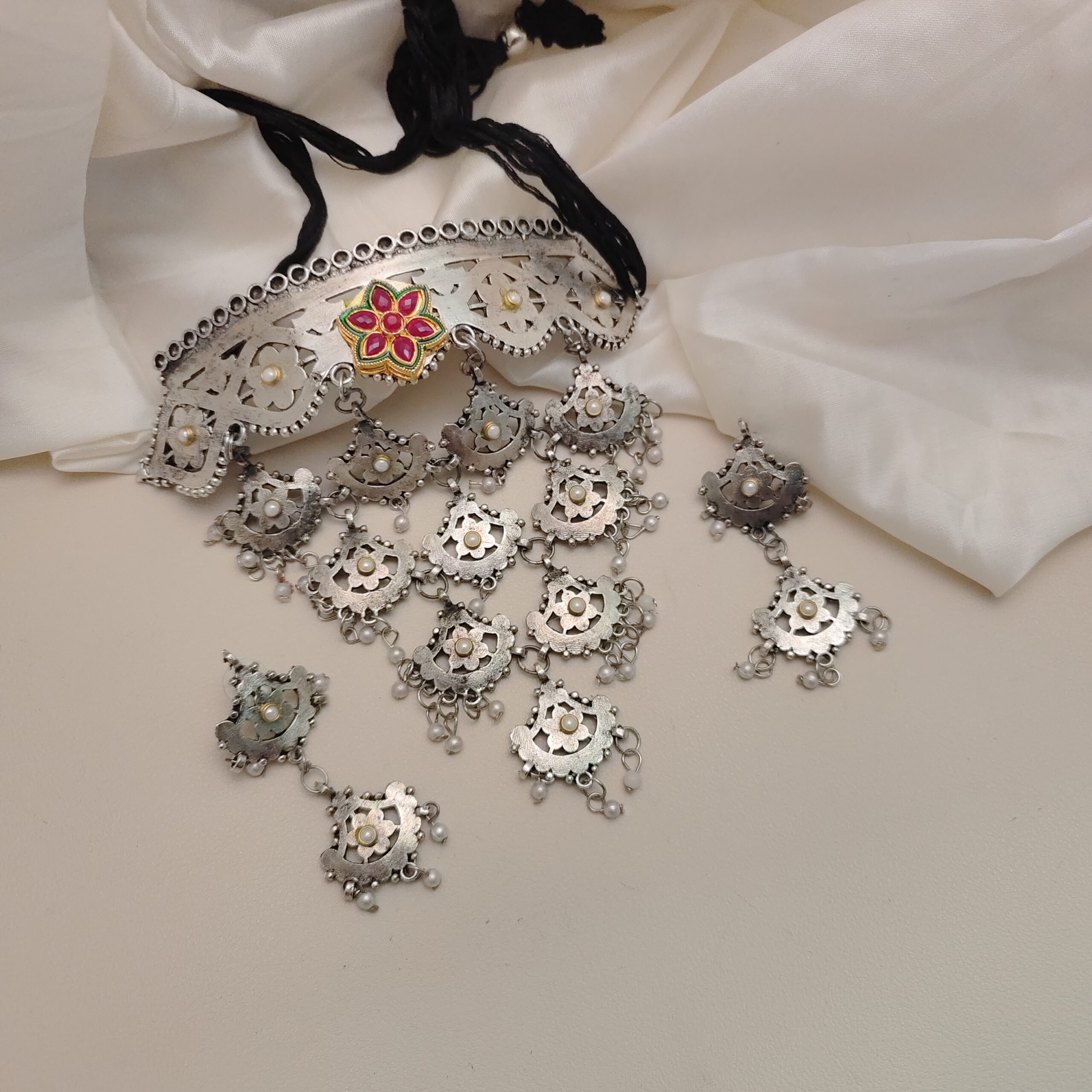Discover timeless elegance with the HRISHA Choker Necklace Earrings Set ,. This exquisite traditional oxidised jewellery set features a stunning choker paired with an intricately designed aad, offering a perfect blend of heritage and modern style. Ideal for any festive or cultural occasion, this set embodies authenticity and sophistication, ensuring you stand out in any crowd. Elevate your ensemble with the unmatched craftsmanship and detail that only , delivers. Experience the perfect harmony of tradition and contemporary allure with this must-have set.