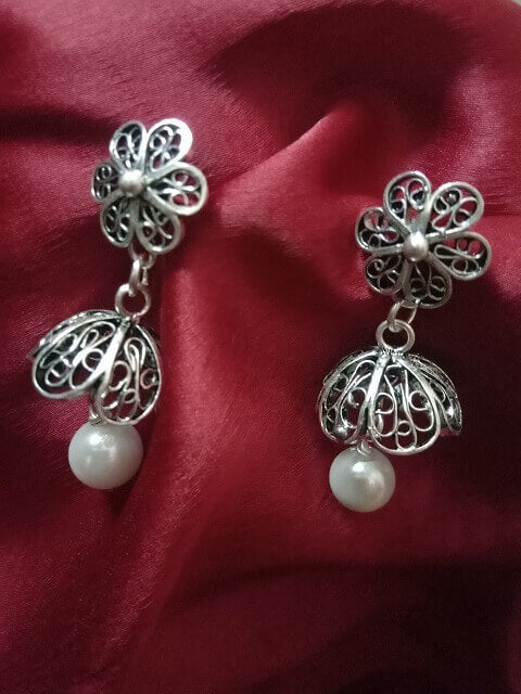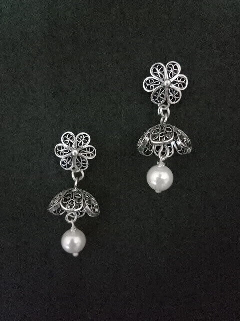 Product Details:Silver Filigree Earrings : Silver Oxidised Pearl Jhumkas