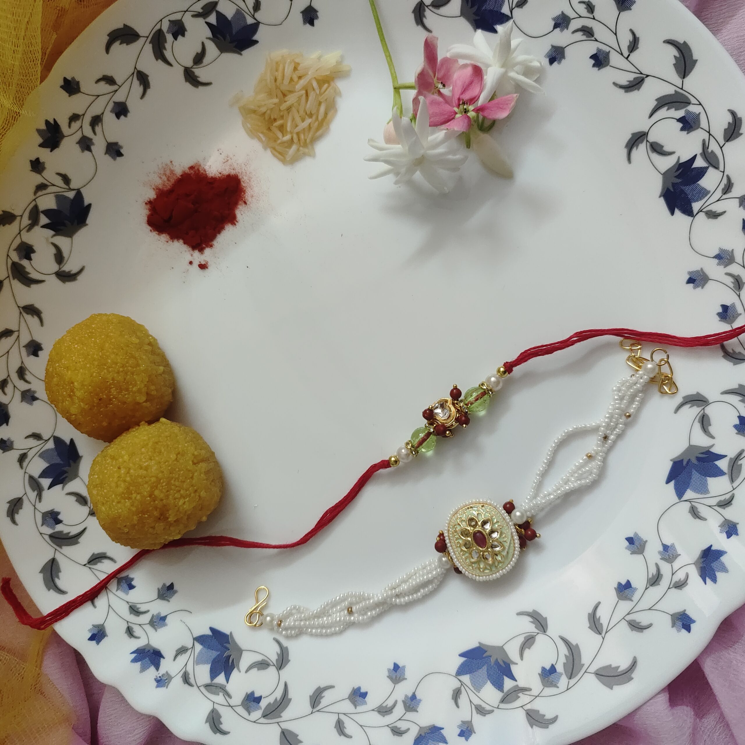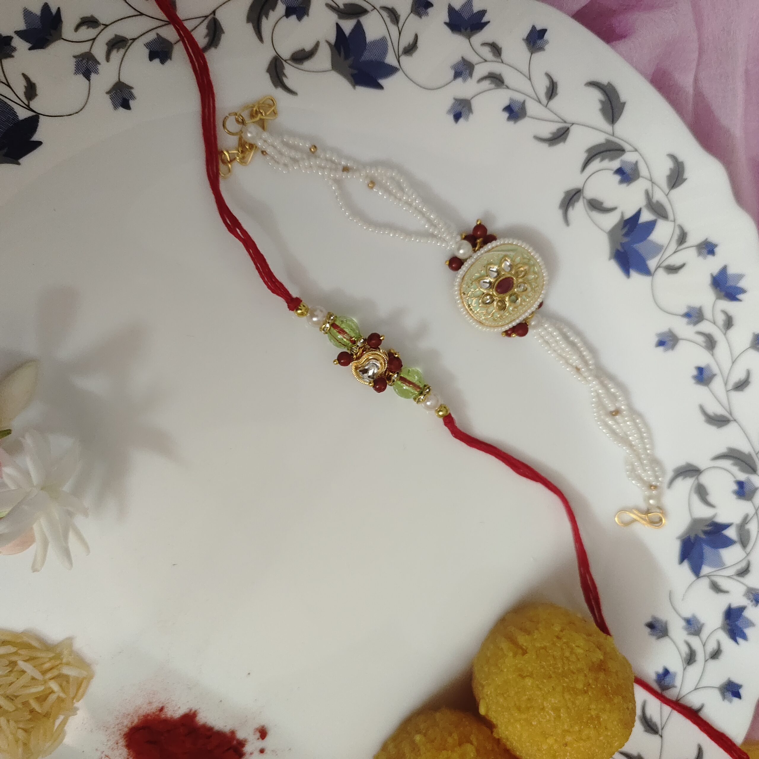 Celebrate the special bond between brothers and sisters with the exquisite KRITI Kundan Bhaiya Bhabhi Rakhi -01. This stunning set includes a traditional Kundan rakhi for the beloved brother and a matching bhabhi rakhi to honor the sister-in-law. The intricate design and sparkling stones make this rakhi set a truly special and memorable gift for Raksha Bandhan. The high-quality materials and craftsmanship ensure that these rakhis will be cherished for years to come. Make this Raksha Bandhan truly unforgettable with the KRITI Kundan Bhaiya Bhabhi Rakhi -01.