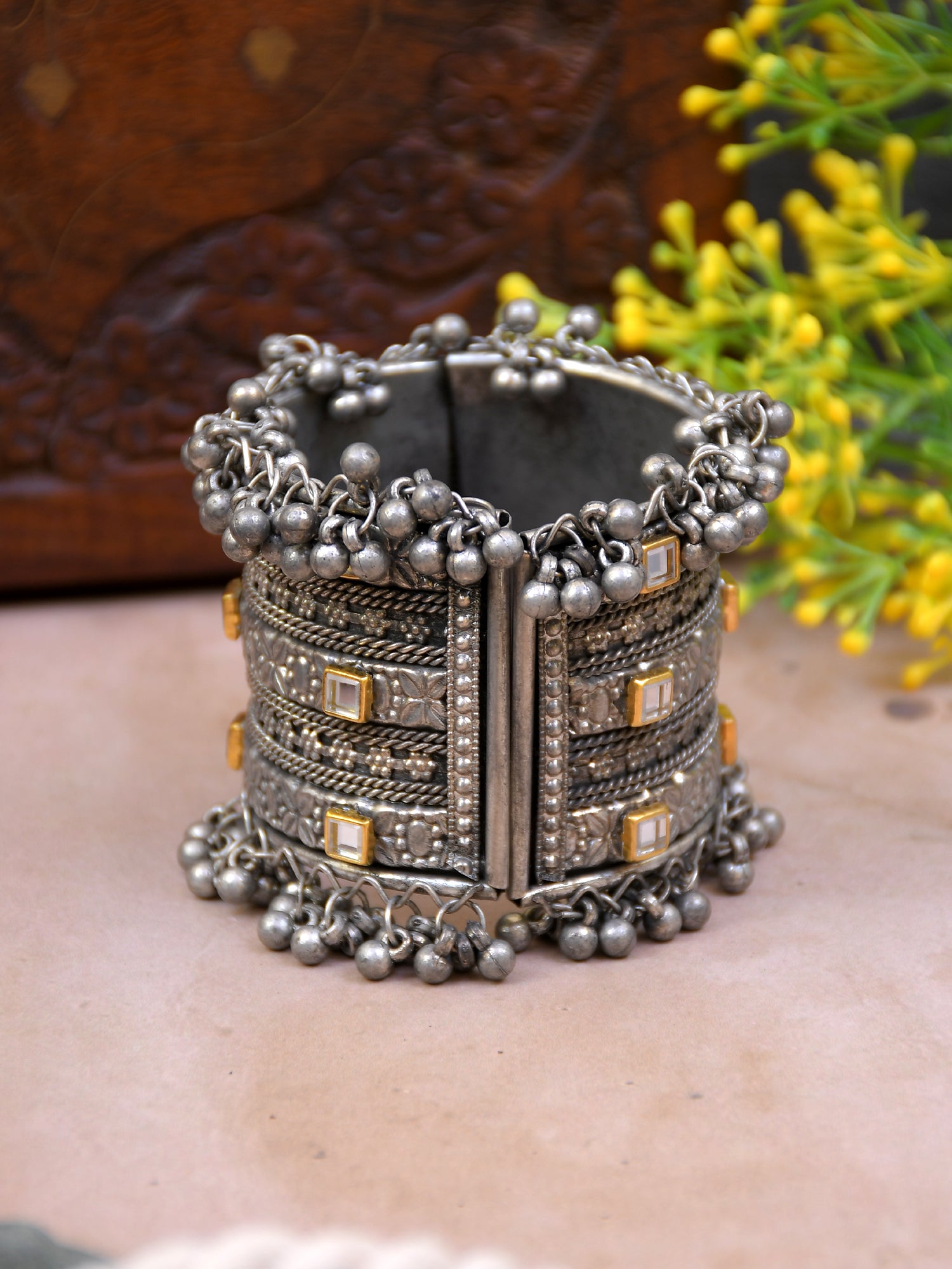 This Kundan Studded Oxidised Silver Jewellery Set is ideal for every women who loves to flaunt her style. This jewellery set is made of alloy and gemstones with oxidised plating which gives it an elegant and modern look. It is perfect for festival, party, engagement or wedding occasions. Its asymmetric design and silver and red colour combination makes it a perfect addition to your wardrobe. It is ideal for spring and summer season. Treat yourself with this handmade oxidised silver necklace, earrings, cuff bracelet and ring combo pack. You can pair it with saree, kurti or any outfit to look modern and traditional at the same time.