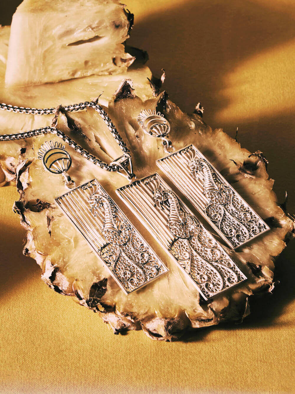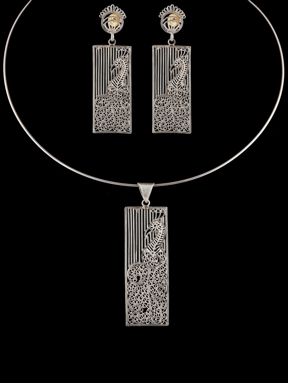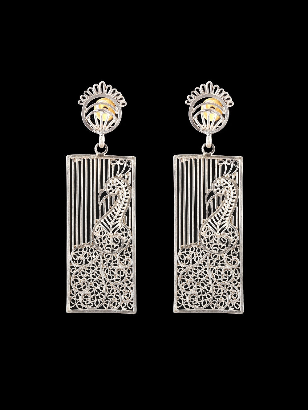 Peacocks symbolize grace, pride, and beauty. They are a sign of joy for all who see them Peacocks are often used in Indian mythology and folk stories. This MORNI (peacock) earrings draw inspiration from the alluring peacock and its feathers that spread out in the monsoon season, reflecting his happiness. This piece creates a statement as it is worn; an exquisite combination of Indianness with modern asymmetrical lines.