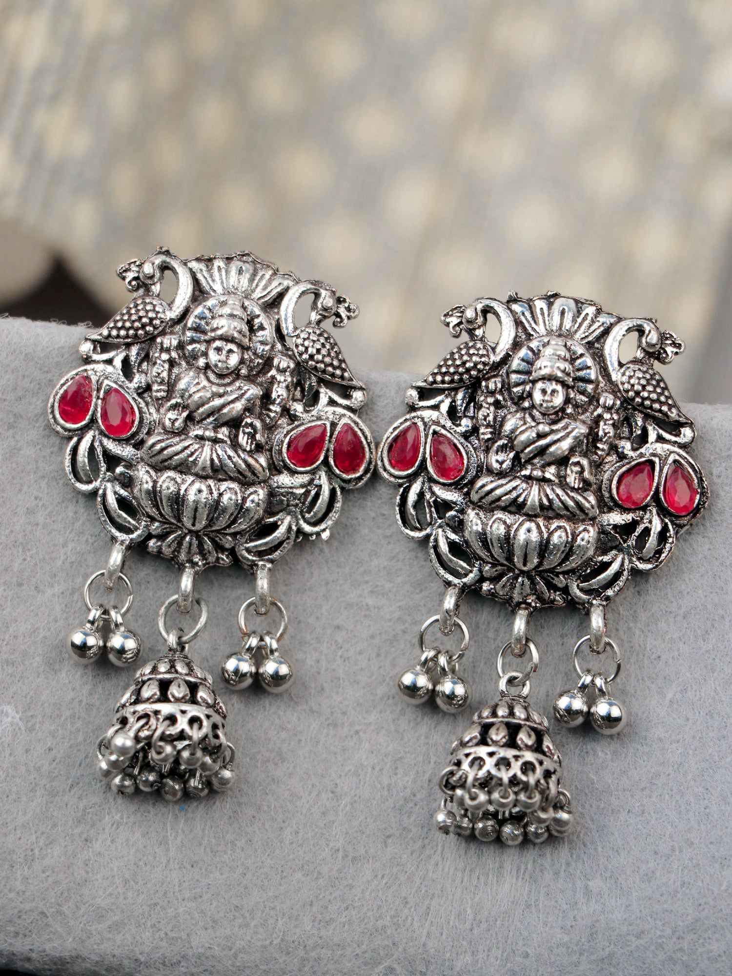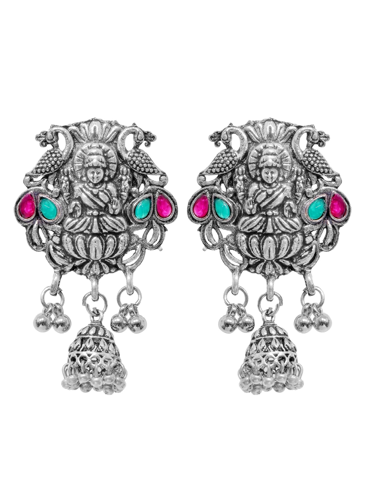 Elevate your style with our ‘Oxidized Silver Indian Goddess Laxmi/Temple Jhumki Earrings’. Handcrafted with impeccable attention to detail, these earrings represent the exquisite beauty of Indian craftsmanship and traditional jewelry. The intricate engravings on the jhumki reflect the divine blessings of Goddess Laxmi, symbolizing prosperity and abundance. Exuding grace and femininity, the jhumki style, adorned with delicate danglers and patterns, enhances your overall look, creating a captivating effect. Ideal for festive occasions, religious ceremonies, or just to add an ethnic touch to your everyday style, these earrings are perfect for those who appreciate the rich heritage of Indian culture and spirituality. The oxidized finish gives a touch of antique charm, ensuring a timeless appeal. Whether you wear them with a red saree or any traditional attire, you will make a stunning impression. Embrace your cultural roots with these ‘Oxidized Silver Indian Goddess Laxmi/Temple Jhumki Earrings’.