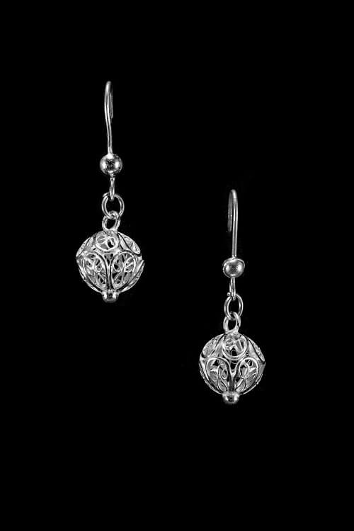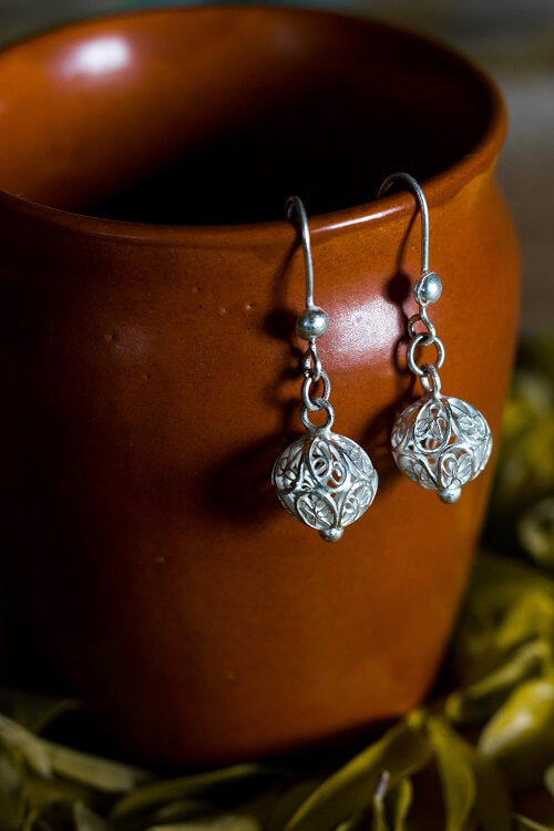 Add a unique touch to your attire with these Silver Bead Dangle Earrings. The Silver filigree earrings are handmade in Cuttack in the fine art of Filigree. The earrings are inspired by the shapes of geometry. The dangles are light weight and look absolutely stunning! The earrings pair well with any attire. The earrings are made with Silver wires.