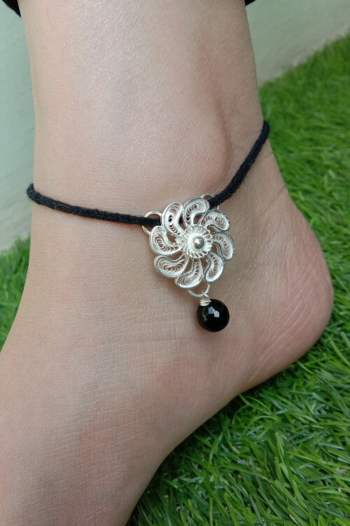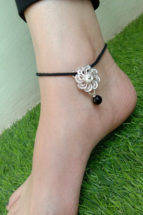 Protect yourself from the evil eye with this black thread Nazarbattu. Nazar Battu Anklet is a black thread anklet worn to ward off the evil eye. This pretty nazarbattu has a Silver Filigree Charm dangling elegently. The charm is inspired by the flowers of India. The nazarbattu is handmade in Cuttack in the fine art of Filigree. The nazarbattu pairs well with any attire and looks absolutely stunning! The nazarbattu charm is made with Silver wires and can be oxidised. It has a black bead at the bottom.