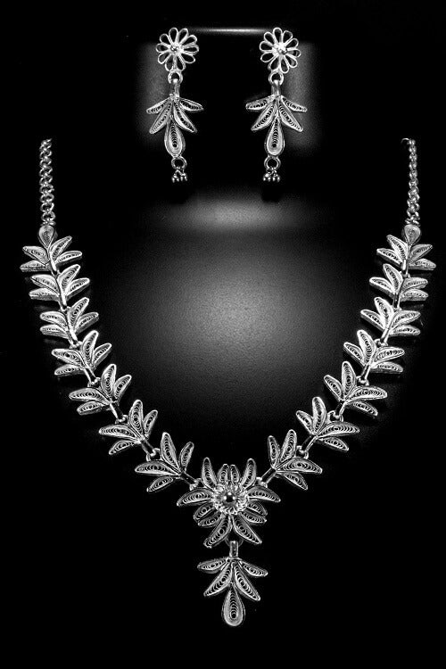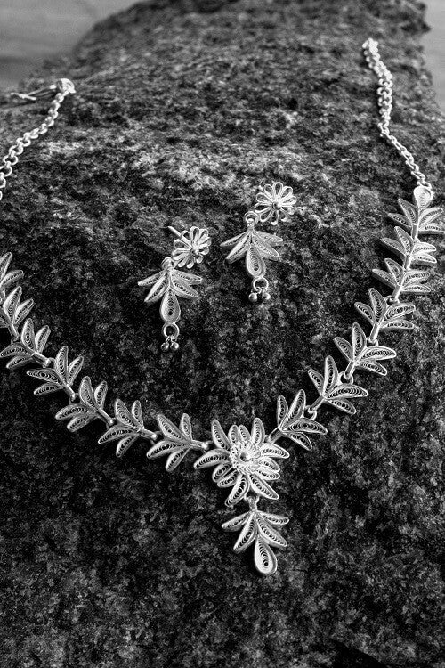 Add a traditional touch to your attire with this Silver Blooming Necklace Set. The Silver Neckace and Earrings are handmade in Cuttack in the fine art of Filigree. The necklace is inspired by the flowers of India. The necklace set looks absolutely stunning with ethnic wear! The necklace has a central floral motif and is adorned with petals. This necklace is one of the favourites in filigree. The set comes with a matching pair of dangles. The jewellery is made with Silver wires.