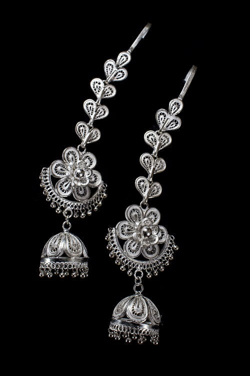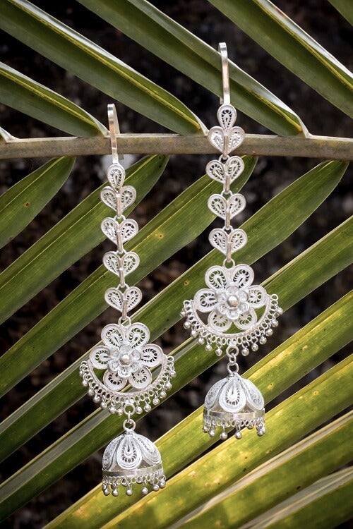 Silver Linings Floral Kaan Chain Silver Filigree Handmade Jhumka Earrings