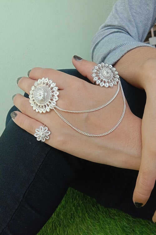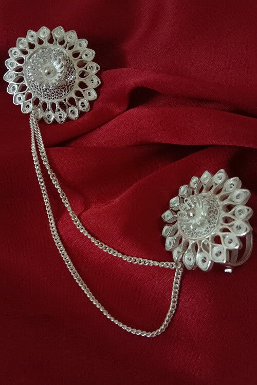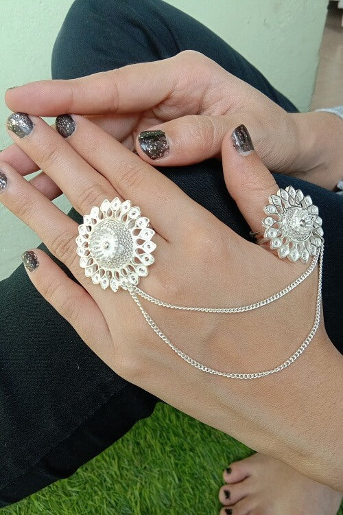Cant get enough of filigree! Wear this dual Gulzar statement Silver ring with an interconnecting silver chain and bloom! The rings can be worn on any two fingers. The Silver filigree Ring is handmade in Cuttack in the fine art of Filigree. The ring is inspired by nature. The rings are light weight and look absolutely stunning! The ring is made with Silver wires.