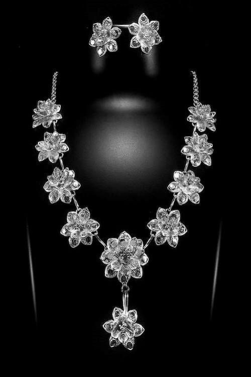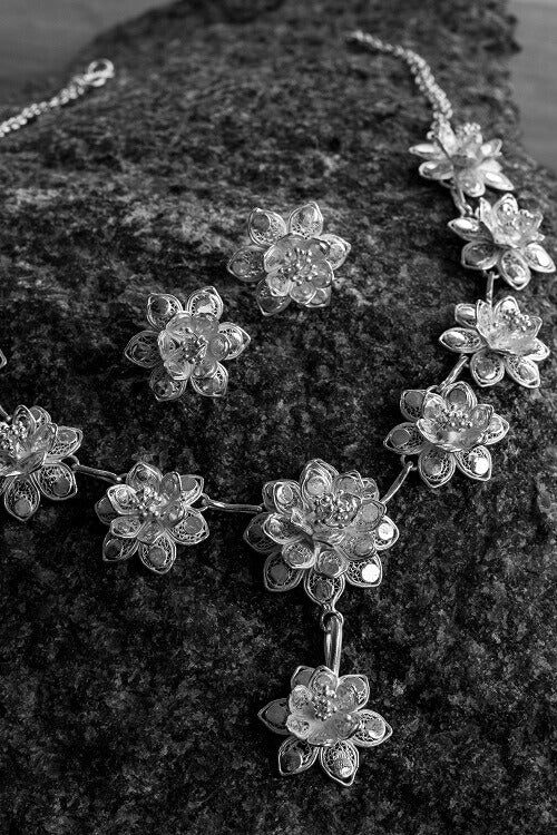 This floral filigreee necklace set is inspired by lotus, this is the set for you if you love lotuses! Do take a look at the intricate tarakasi work in each petal. This Necklace is made of 80% silver in the fine art of Filigree work of Cuttack. About us : Silver Linings was started by a 2nd generation Filigree family to save this art from extinction. We at Silver Linings are committed to reviving this dying art of Silver Filigree. We work with 50 artisans in Cuttack to revive promote the handicraft. We aim to make this art reachable and available to patrons across the world while ensuring that the artisans get their due credit and support.