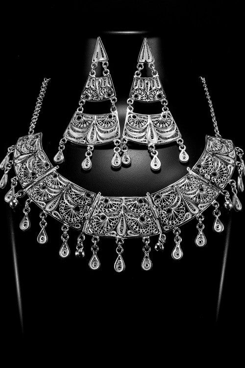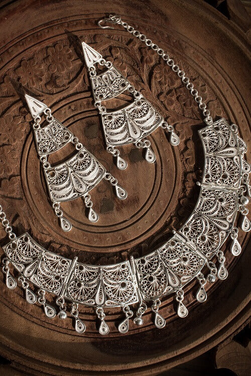 Add a traditional touch to your attire with this Silver Mughal Choker Necklace Set. The Silver Neckace and Earrings are handmade in Cuttack in the fine art of Filigree. The necklace is inspired by the intricate Mehemdi design. The necklace set looks absolutely stunning with ethnic wear! The necklace has exquisite filigree work around the neck and bold earrings. This necklace is one of the favourites in filigree. The set comes with a matching pair of dangles. The jewellery is made with Silver wires.