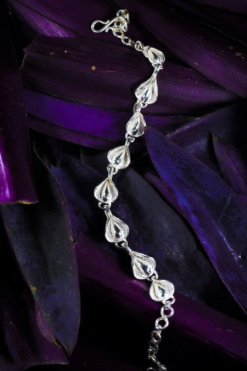 Looking for a more simplistic style? Try our Pankhuri Silver Filigree bracelet. The bracelet is inspired by the petals. The bracelet is a worthy addition to your accessories box. Wear this delicate efflorescent bracelet and blossom!
