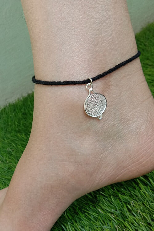 Protect yourself from the evil eye with this black thread Nazarbattu. Nazar Battu Anklet is a black thread anklet worn to ward off the evil eye. This pretty nazarbattu has a Silver Filigree Charm dangling elegently. The charm is inspired by the petals. The nazarbattu is handmade in Cuttack in the fine art of Filigree. The nazarbattu pairs well with any attire and looks absolutely stunning! The nazarbattu charm is made with Silver wires and can be oxidised.