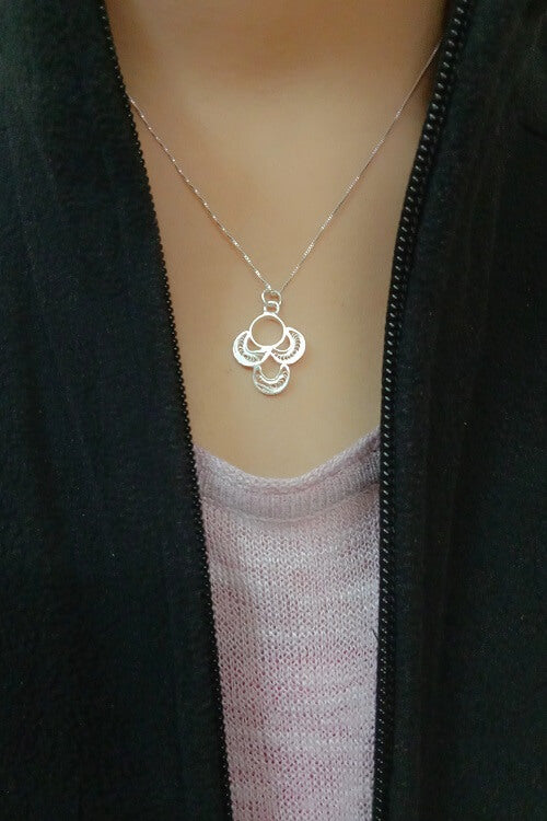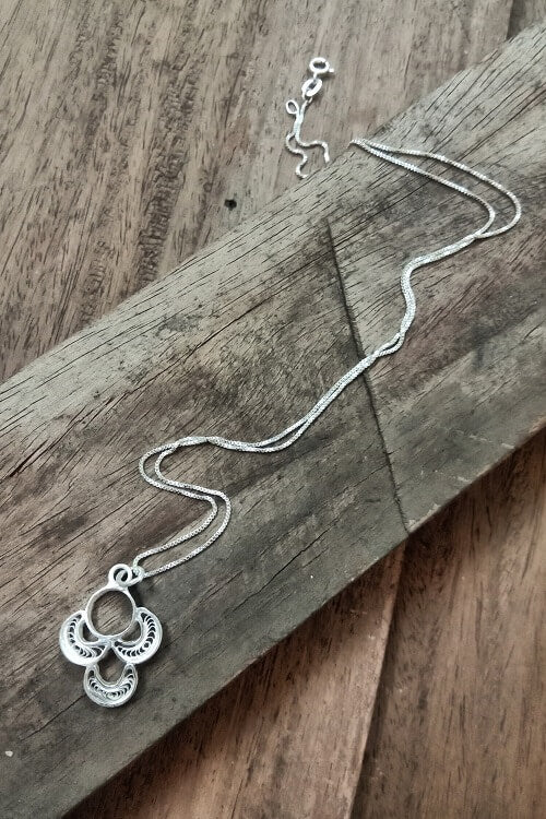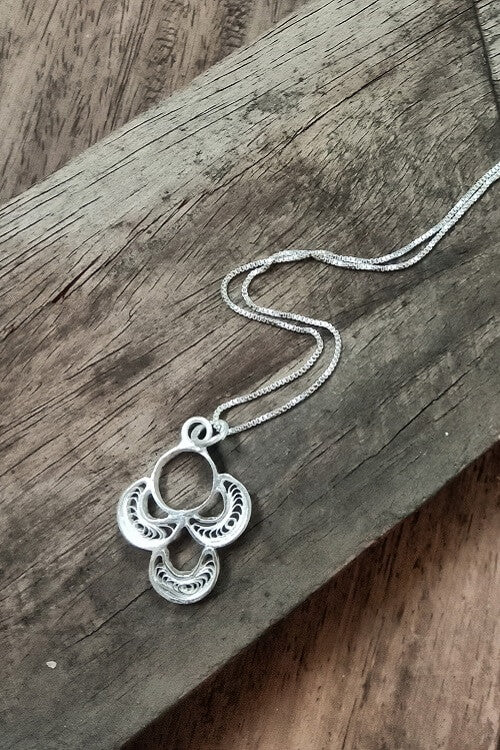 Length of chain : 17 Delivery : The jewelry is shipped within 2 days and will be delivered in 7-9 business days. About the craft: Silver Filigree is a handicraft in which silver wires are put together to create delicate and intricate designs. Filigree is done extensively In Cuttack and Karimnagar. The process of making filigree jewelry starts with drawing Silver wires from Silver Blocks. The thinner the wire, the more intricate the filigree work. The artisans first create the outer frame of the motif with silver wires and then fill the inside with intricate wires. The wires are then soldered together and polished .. and a timeless masterpiece is created! About us: Silver Linings was started by a 2nd generation Filigree family to save this art from extinction. We at Silver Linings are committed to reviving this dying art of Silver Filigree. We work with 50 artisans in Cuttack to revive promote the handicraft. We aim to make this art reachable and available to patrons across the world while ensuring that the artisans get their due credit and support. Returns policy: We accept returns only for defective or wrong products within 2 days of delivery.
