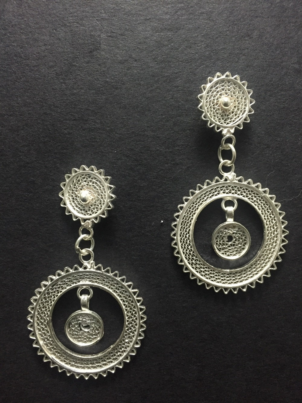 This is an excellent example of Filigree art that Silverlinings’ stands for. This drop earring is one of those inspired by the jewellery box of our moms. The circles made of minute Filigree work combine symmetry with beauty. Wear it with ethnic wears and look “gracefulâ€!!!Â