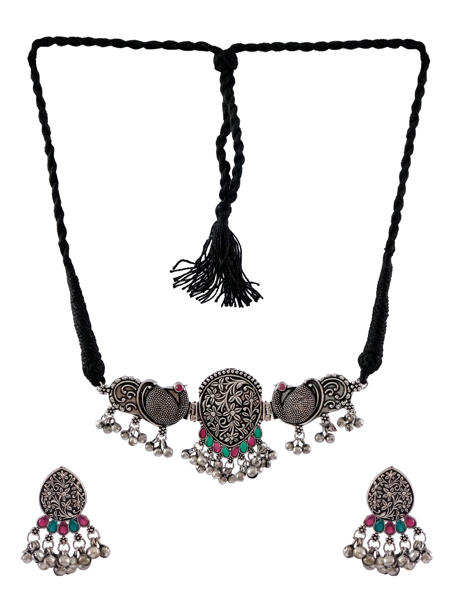 Traditional Oxidised Silver Multicolor Peacock Design Necklace Set With Earrings for Women