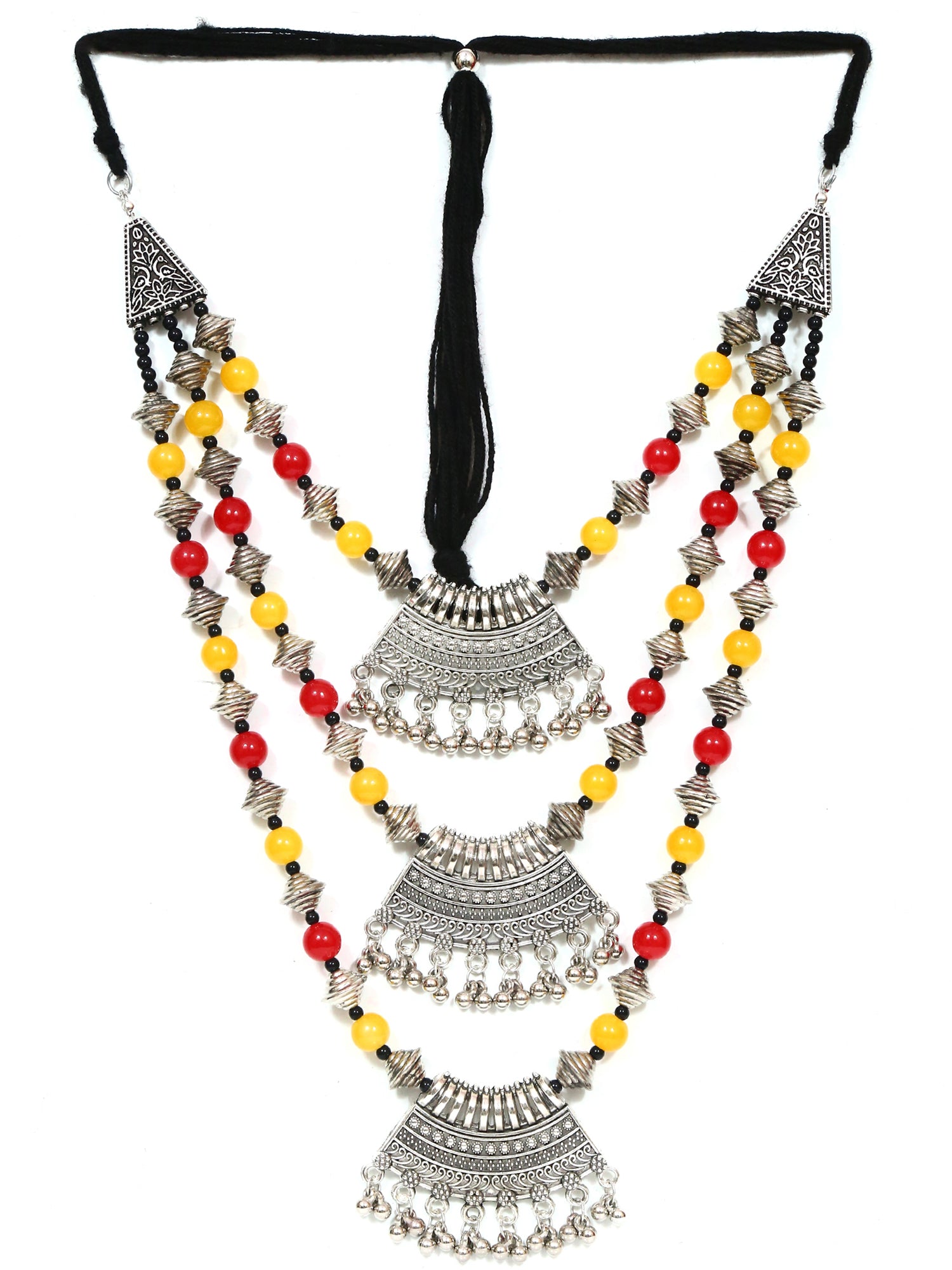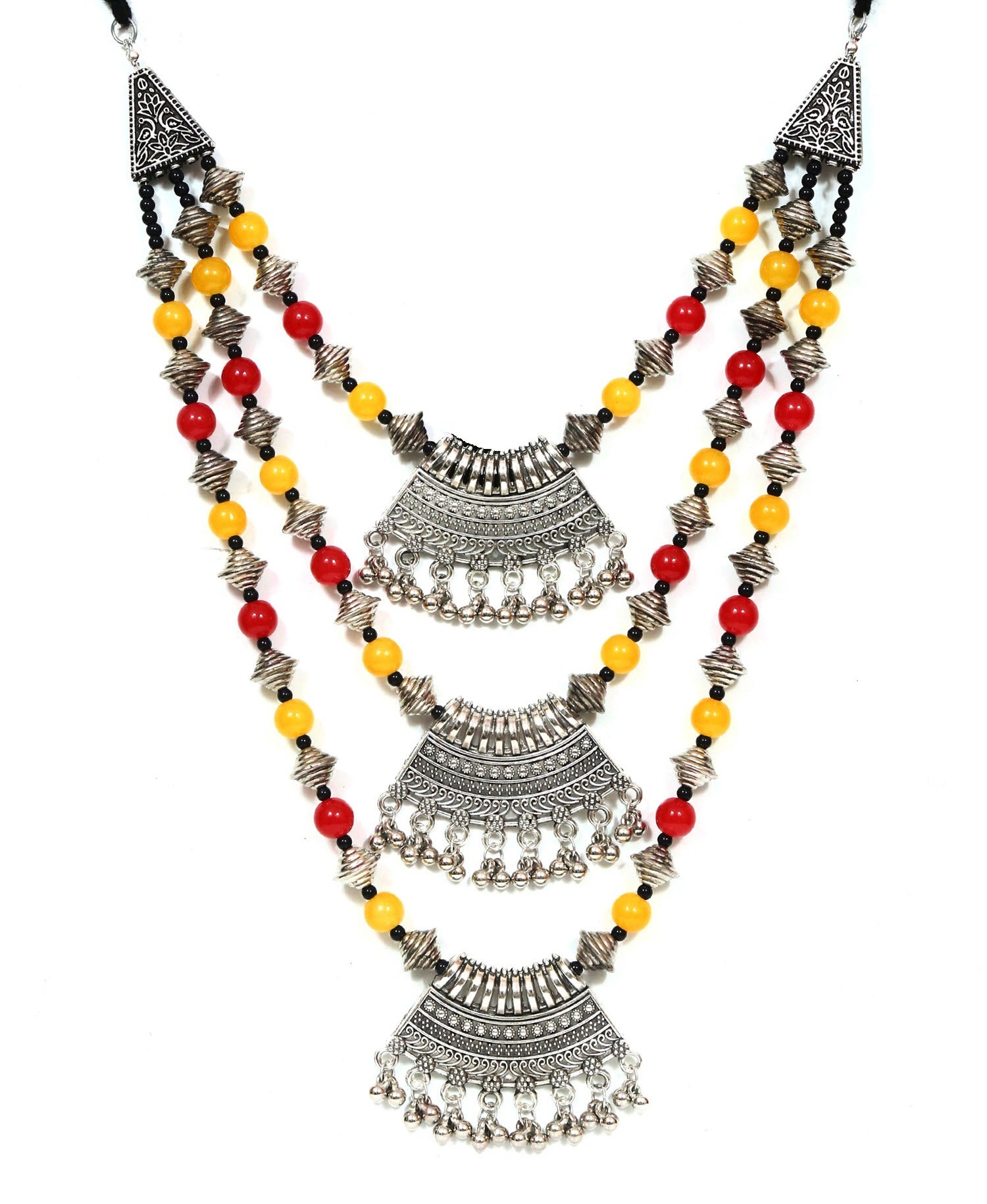 Introducing the Oxidised Silver Necklace with Red & Yellow Pearls for Women – an exquisite piece of Multi-Layer Saree Jewelry. This silver necklace set, inspired by the recent trend of oxidised jewellery, has been designed with the modern, fashion-savvy woman in mind. It boosts your style quotient by adding a burst of glamour to your saree or other ethnic attire. This oxidised necklace, uniquely crafted, is embedded with striking red and yellow pearls that are intricately woven into layered strands. The result is a visually impressive piece of oxidised jewellery set that doesn’t just elevate your personal style, but also leaves a lasting impression. Ideal for those who appreciate innovative fashion accessories, this silver necklace jewelry speaks of individuality and elegance in equal measures. Give your online shopping journey a lift by adding this tailor made jewellery piece to your collection, or gift this ornate red & yellow pearls multi-layer necklace to a loved one. Seize the opportunity of owning this classy Oxidised Silver with Red & Yellow Pearls Multi Layer Necklace now!