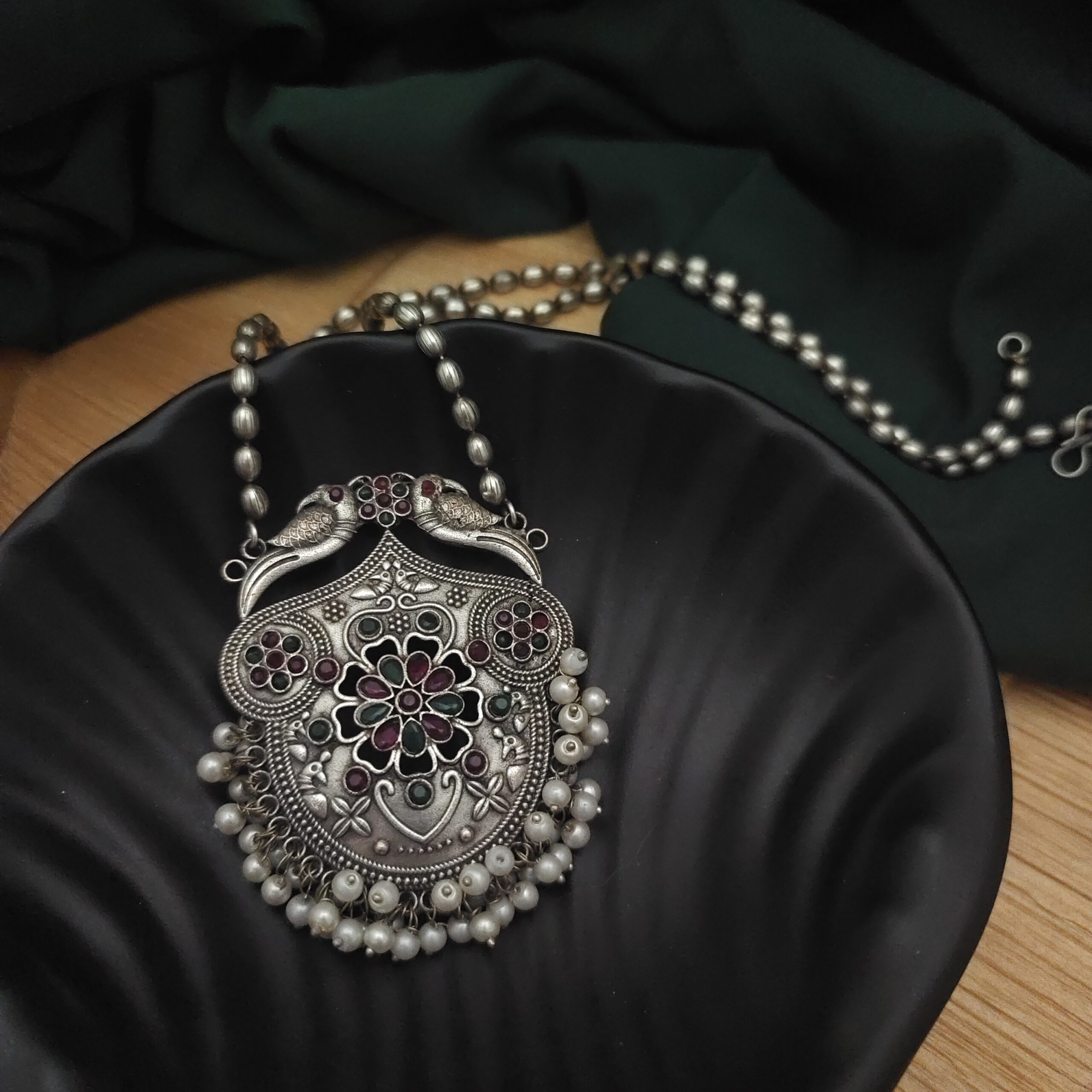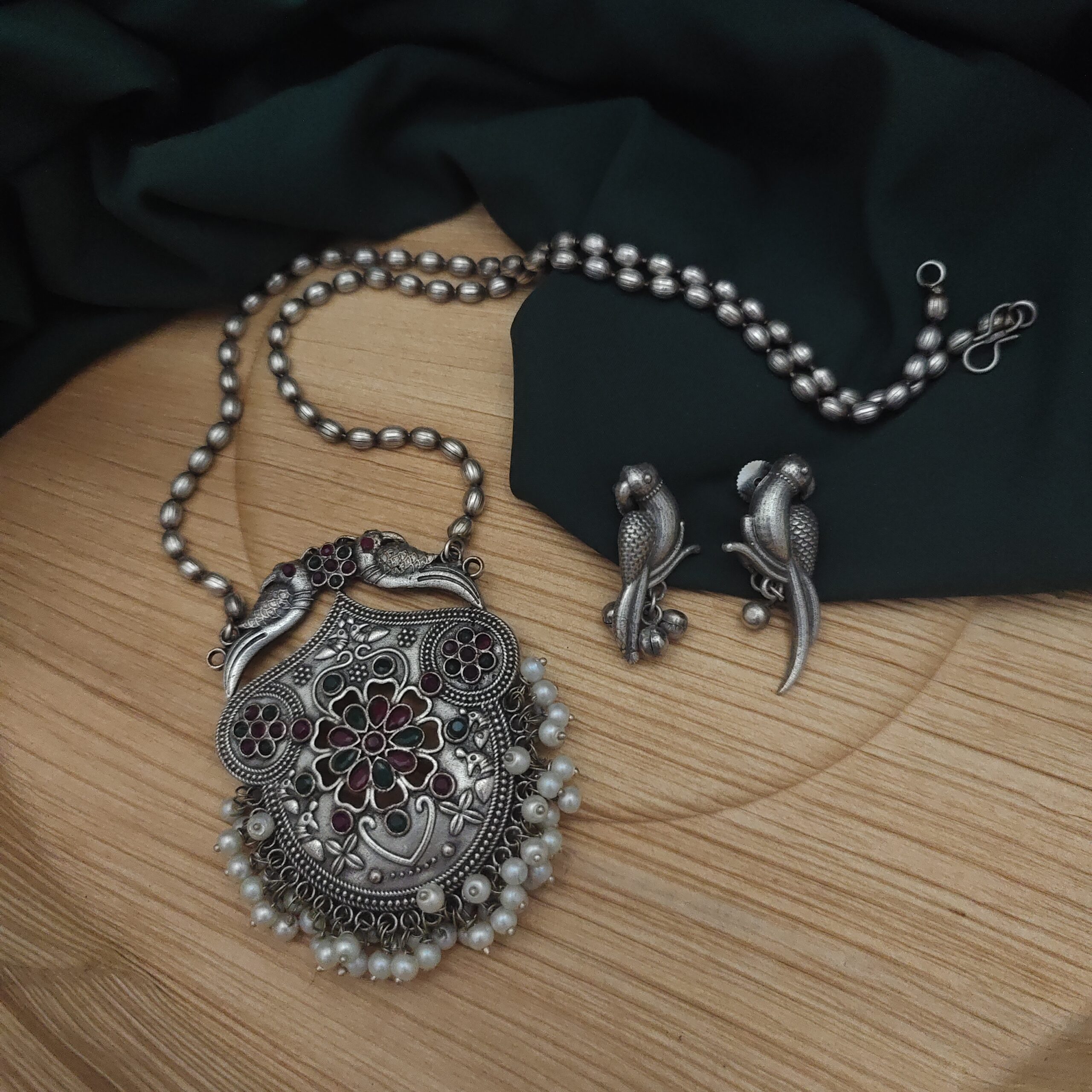 Yashsvi Silver Replica Brass Necklace Earrings Set-Red Green